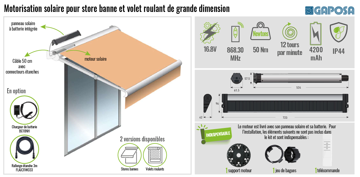 Kit moteur Solaire Gaposa 50 Nm - Volet roulant - Store - XQBPLX5012